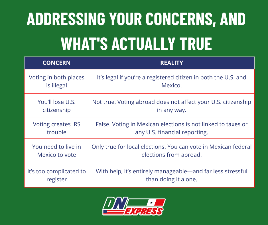 | Voting creates IRS trouble | This is a myth. The IRS doesn't track your voting activity, only your income and tax filings. Participating in Mexican elections does not trigger audits, reports, or penalties. |