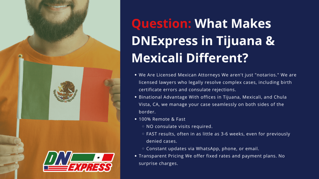 DNExpress South of the Border, with legal offices in Tijuana and Mexicali, helps U.S.-born Mexicans fix documents, reclaim nationality, and apply for passports 100% remotely.