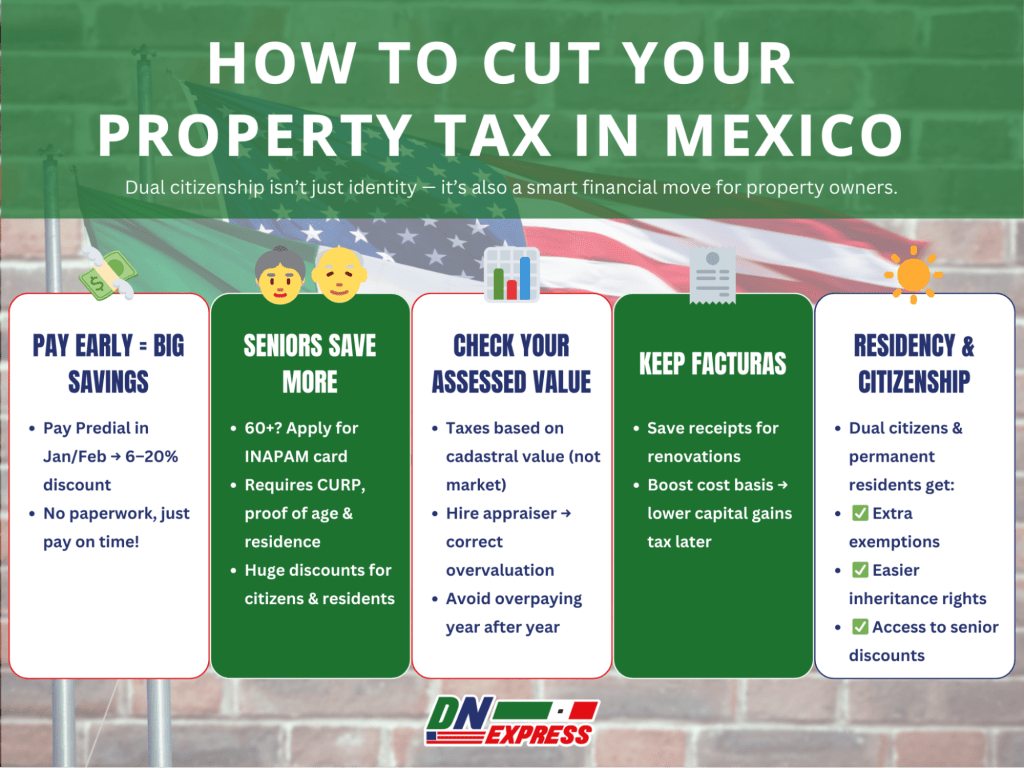 Unlike in the U.S., where primary residences often receive homestead exemptions, Mexico offers few standard deductions. That said, INAPAM cardholders (seniors over 60) may qualify for discounts. Some municipalities offer early-bird incentives for January or February payments.