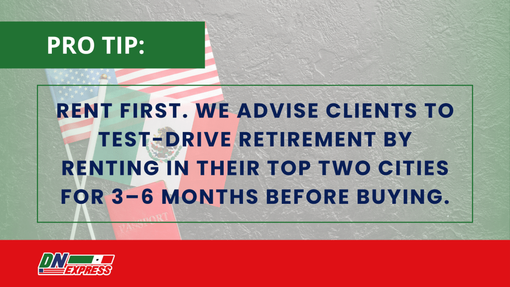 Before you buy property or make a permanent move, spend a few months living in your top-choice city. Mérida, San Miguel, and Lake Chapala are great places to start, but every region has its own rhythm and cost of living.