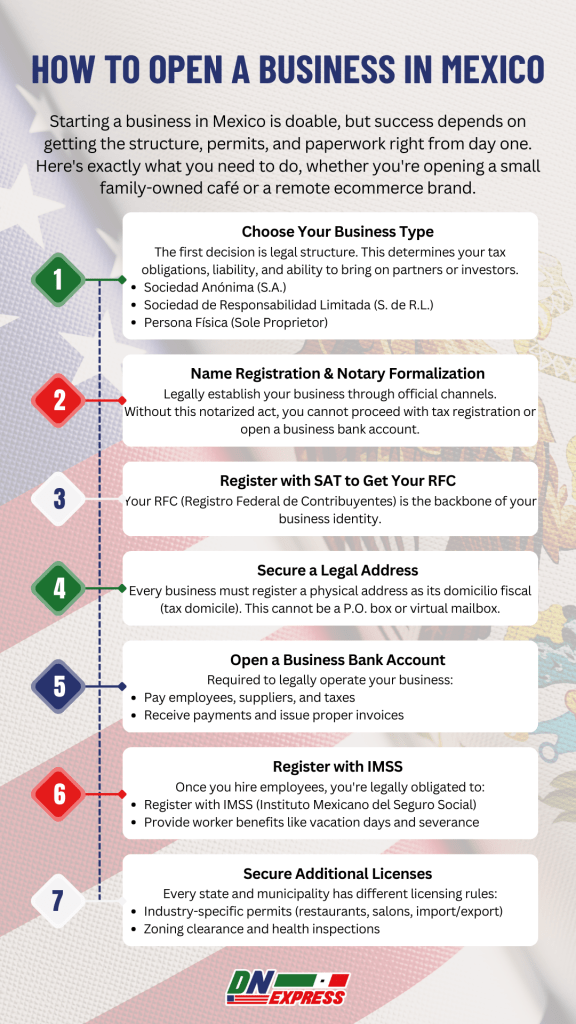 Foreigners and Mexican-Americans can open a business in Mexico legally. You'll need to choose a business structure, register with the SAT (tax authority), open a Mexican bank account, and follow labor and permit regulations.