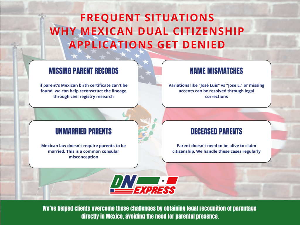 Many people are denied Mexican dual citizenship due to document errors, parental marital status, or consulate inconsistencies.