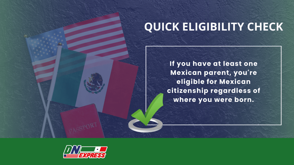 Mexican nationality law does not require your parents to have been married before your birth. If you have a Mexican parent, you’re eligible, even if they married later or never married at all.