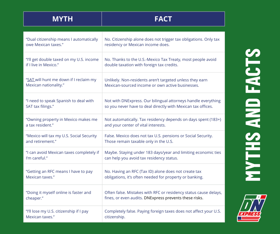 | “I’ll lose my U.S. citizenship if I pay Mexican taxes.” | Completely false. Paying foreign taxes does not affect your U.S. citizenship. |