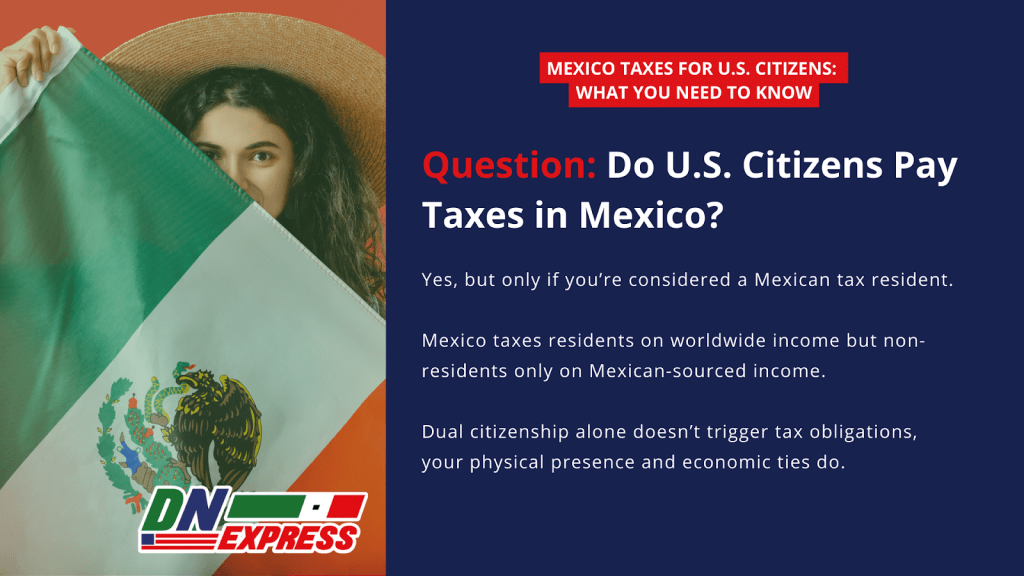 If you’re a U.S. citizen with Mexican ties, dual citizenship, property, or plans to retire, you only pay Mexican taxes if you’re considered a tax resident. Residency means 183+ days in Mexico or significant economic ties like a home or business.