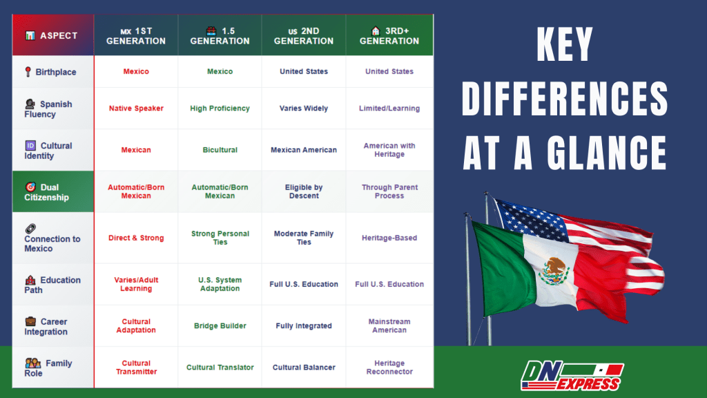 1st: Mexican-born adult who immigrated. 1.5: Mexican-born, arrived young to the U.S. 2nd: U.S.-born, Mexican-born parent(s). 3rd: U.S.-born parents, Mexican-born grandparent(s).